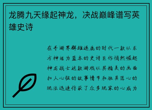 让每一场战斗,都成为传奇!